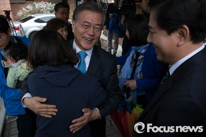 (서울=포커스뉴스) 선거운동이 시작되고 첫 주말을 맞은 3일 오전 문재인 전 더불어민주당 대표가 서울 동작구 신대방성당에서 김병기 더불어민주당 동작갑 후보를 찾아 합동유세를 하고 있다.