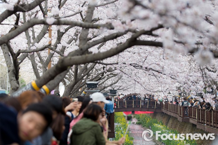 (창원=포커스뉴스) 2일 오후 경남 창원시 진해구 여좌천을 찾은 관광객들이 만개한 벚꽃을 보며 즐거운 시간을 보내고 있다.