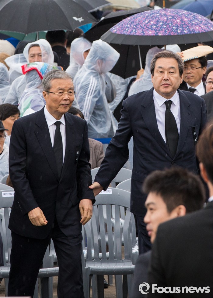 (제주=포커스뉴스) 3일 오전 제주 4ㆍ3 평화공원에서 열린 제68주년 4ㆍ3희생자 추념식에 참석한 김무성(오른쪽) 새누리당 대표가 김종인 더불어민주당 비상대책위원회 대표의 소매를 잡고 추모단으로 향하고 있다.