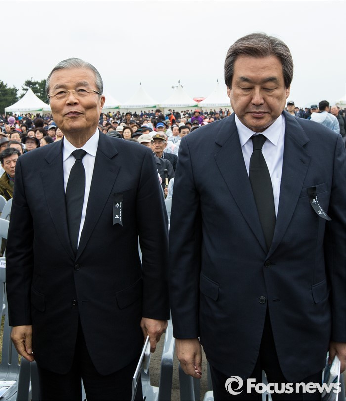 (제주=포커스뉴스) 3일 오전 제주 4ㆍ3 평화공원에서 열린 제68주년 4ㆍ3희생자 추념식에 참석한 김무성(오른쪽) 새누리당 대표와 김종인 더불어민주당 비상대책위원회 대표가 착석하고 있다.