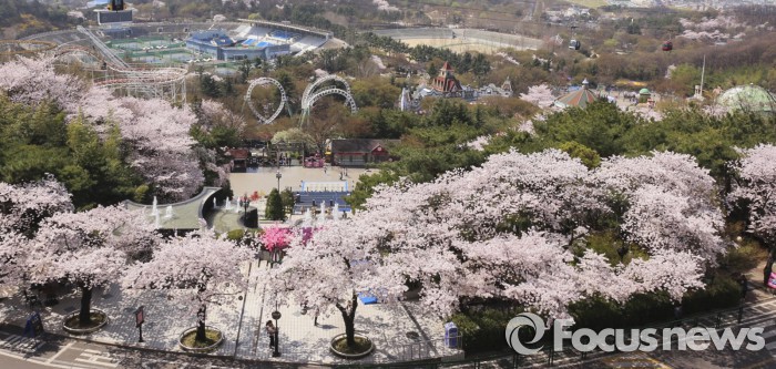 축제와 관련한 자세한 정보는 공식 홈페이지(http://eworld.kr)에서 확인할 수 있다.벚꽃이 만개한 대구 이월드 전경.<사진제공=이랜드>