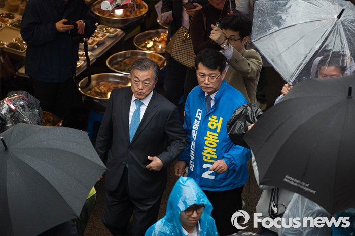 (서울=포커스뉴스) 선거운동이 시작되고 첫 주말을 맞은 3일 오후 문재인 전 더불어민주당 대표가 서울 동작구 남성시장에서 허동준 더불어민주당 동작을 후보와 합동유세를 하고 있다.