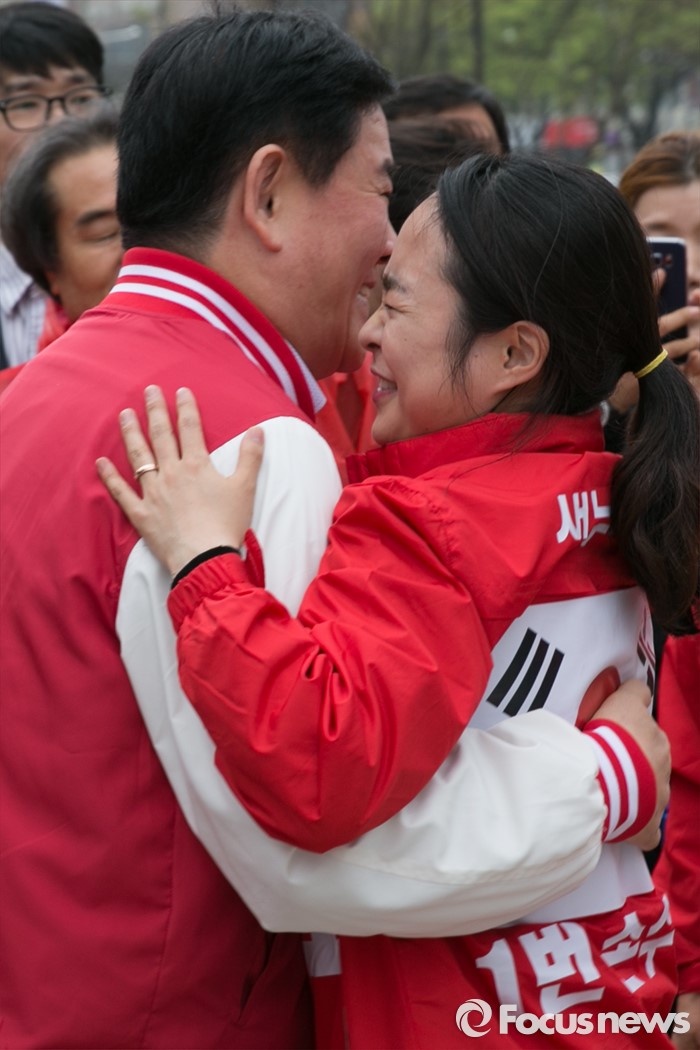 (부산=포커스뉴스) 최경환(왼쪽) 전 경제부총리와 손수조 새누리당 부산 사상구 후보가 3일 오후 부산광역시 사상구 광장로의 한 대형마트 앞에서 열린 손 후보 유세장에서 포옹하고 있다.