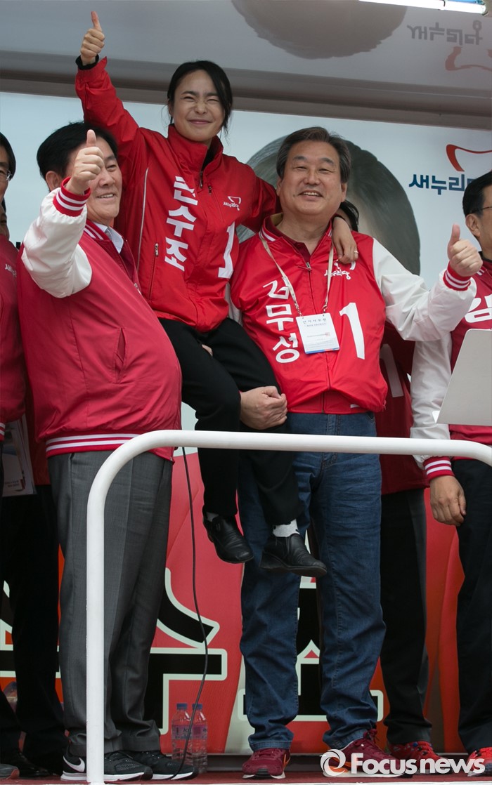 (부산=포커스뉴스) 김무성(오른쪽) 새누리당 대표와 최경환(왼쪽) 전 경제부총리가 3일 오후 부산광역시 사상구 광장로의 한 대형마트 앞에서 손수조 사상구 후보 지원유세에 참석해, 손 후보를 들고 있다.