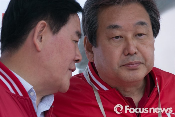 (부산=포커스뉴스) 김무성(오른쪽) 새누리당 대표와 최경환 전 경제부총리가 3일 오후 부산광역시 사상구 광장로의 한 대형마트 앞에서 손수조 사상구 후보 지원유세에 참석해, 대화하고 있다.