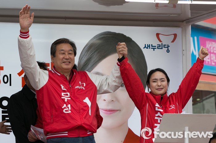 (부산=포커스뉴스) 김무성(왼쪽) 새누리당 대표가 3일 오후 부산광역시 사상구 광장로의 한 대형마트 앞에서 손수조 사상구 후보 지원유세에 참석해, 손 후보의 손을 들고 있다.