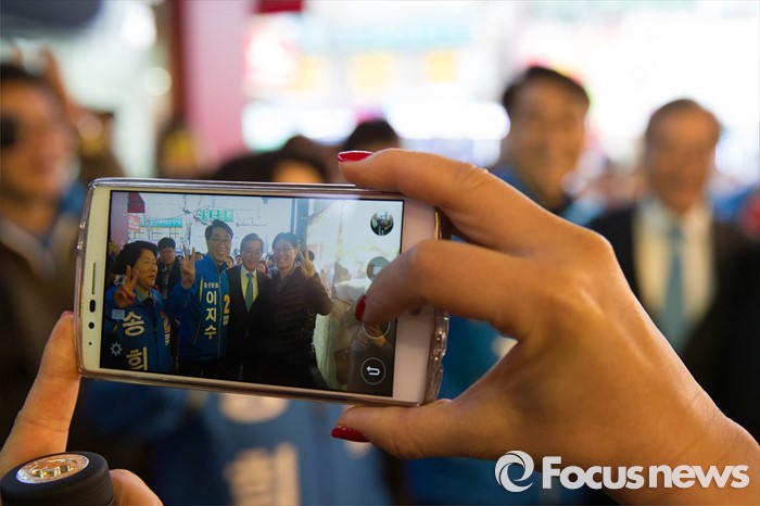(서울=포커스뉴스) 선거운동이 시작되고 첫 주말을 맞은 3일 오후 문재인 전 더불어민주당 대표가 서울 중구 중앙시장에서 이지수 더불어민주당 중구 성동을 후보와 합동유세를 하고 있다.