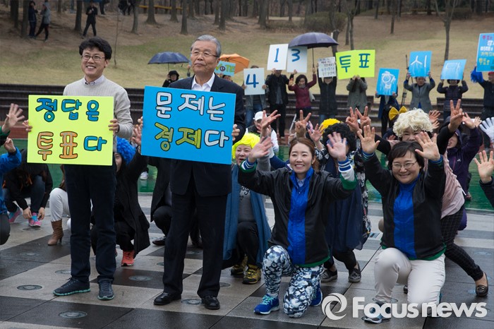 (서울=포커스뉴스) 3일 오후 서울 강서구 방화근린공원 일대에서 김종인 더불어민주당 비대위 대표 겸 선대위원장이 진성준 강서을 후보와 함께 유세를 하고 있다.