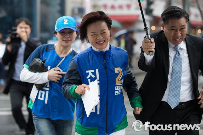 (서울=포커스뉴스) 선거운동이 시작되고 첫 주말을 맞은 3일 오후 문재인 전 더불어민주당 대표가 서울 강동구 암사시장에서 진선미 더불어민주당 강동구갑 후보와 합동유세를 하고 있다.