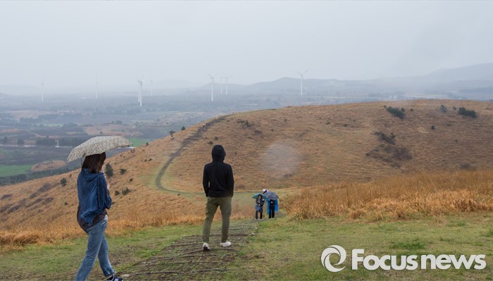 (제주=포커스뉴스) 3일 오후 제주 용눈이오름을 찾은 관광객들이 제주의 풍광을 즐기고 있다.