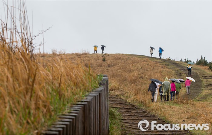 (제주=포커스뉴스) 3일 오후 제주 용눈이오름을 찾은 관광객들이 제주의 풍광을 즐기고 있다.