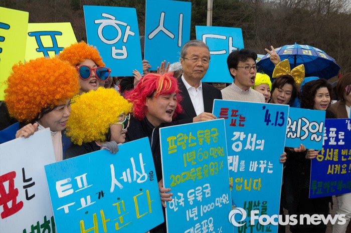 (서울=포커스뉴스) 3일 오후 서울 강서구 방화근린공원 일대에서 김종인 더불어민주당 비대위 대표 겸 선대위원장이 진성준 강서을 후보와 함께 유세를 하고 있다.