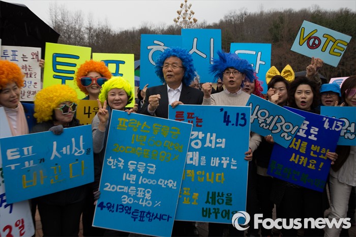 (서울=포커스뉴스) 3일 오후 서울 강서구 방화근린공원 일대에서 김종인 더불어민주당 비대위 대표 겸 선대위원장이 진성준 강서을 후보와 함께 유세를 하고 있다.