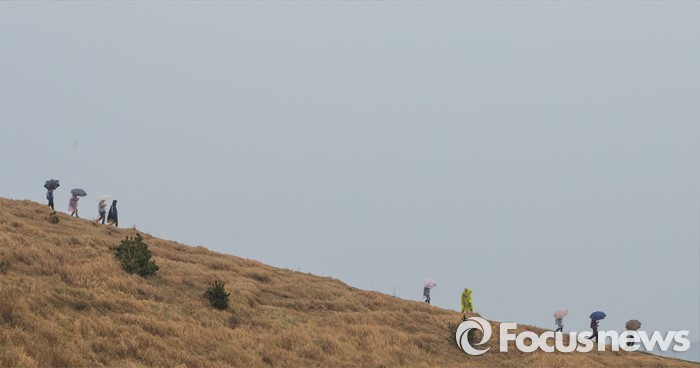 (제주=포커스뉴스) 3일 오후 제주 용눈이오름을 찾은 관광객들이 제주의 풍광을 즐기고 있다.