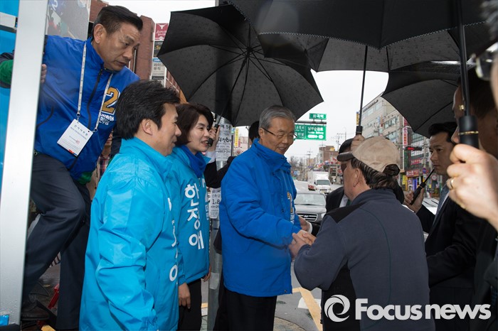 (서울=포커스뉴스) 3일 오후 서울 강서구 화곡역 사거리에서 김종인 더불어민주당 비대위 대표 겸 선대위원장이 강서갑 금태섭, 강서병 한정애 후보와 함께 유세를 하고 있다.