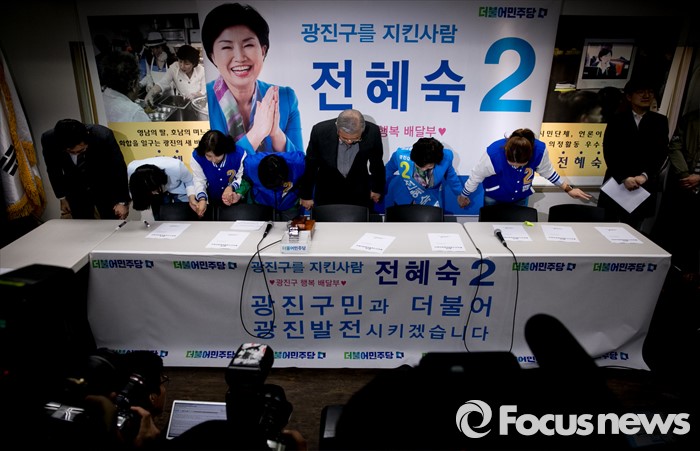 (서울=포커스뉴스) 4일 오전 전혜숙 더불어민주당 서울 광진갑 후보 선거사무소에서 중앙선거대책위원회의에 앞서 김종인 비대위 대표 겸 선대위원장, 전 후보, 장하나 의원과 비례대표 후보들이 20대 총선 사전투표 독려 캠페인을 마친 뒤 인사하고 있다.