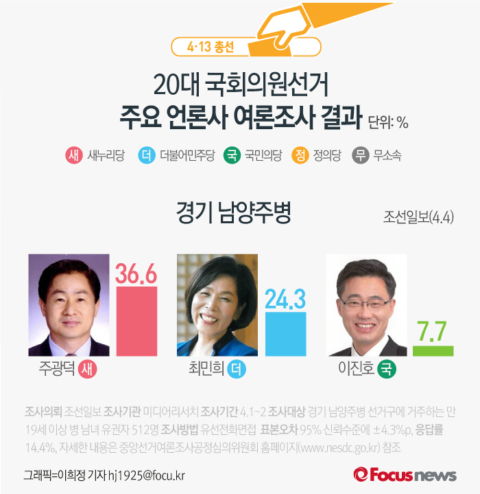 (서울=포커스뉴스) 조선일보가 미디어리서치에 의뢰해 4일 발표한 여론조사 결과에 따르면 새누리당 주광덕 후보의 지지율은 36.6%, 더불어민주당 최민희 후보의 지지율은 24.3%, 국민의당 이진호 후보는 7.7%를 기록했다.