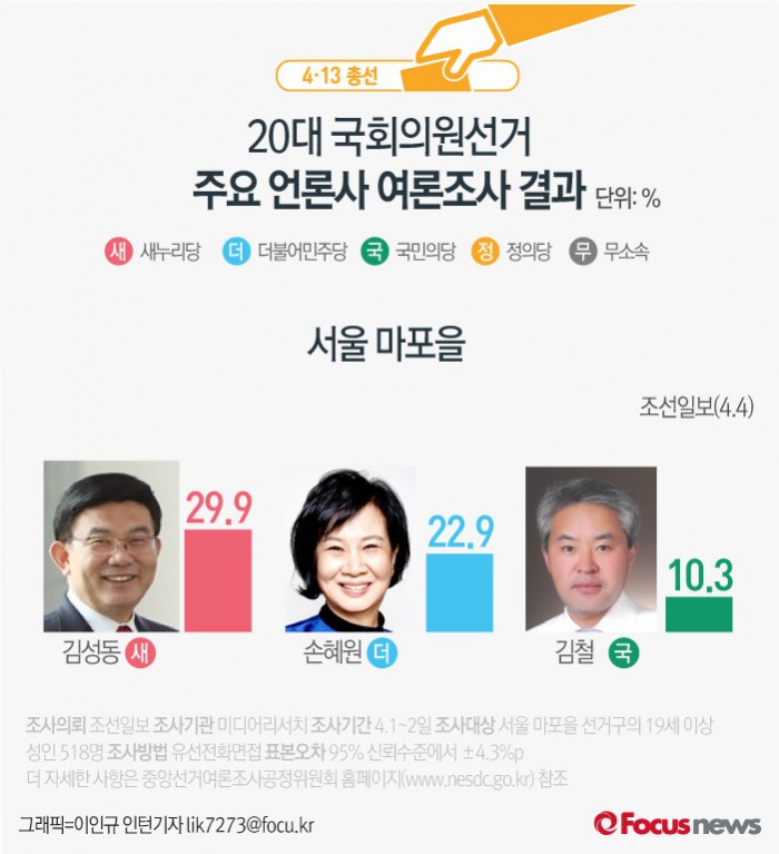 (서울=포커스뉴스) 조선일보가 여론조사기관 미디어리서치에 의뢰해 4일 발표한 결과에 따르면 마포을 지지율은 김성동 후보(29.9%), 더민주 손혜원 후보(22.9%) 순으로 나타났다.