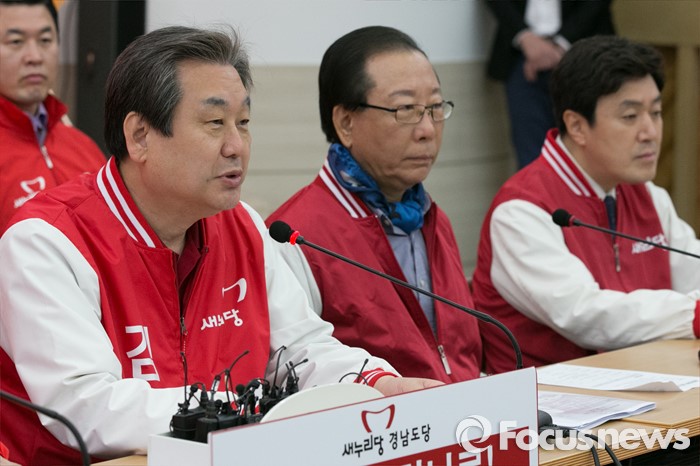 (창원=포커스뉴스) 김무성(왼쪽) 새누리당 대표가 4일 오전 경남 창원시 의창구 원이대로 경남도당에서 열린 중앙선대위 현장 대책회의에 참석해, 모두발언하고 있다.