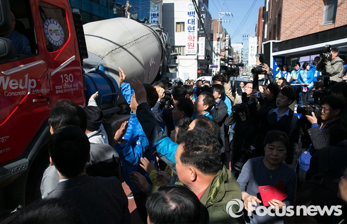 (서울=포커스뉴스) 4일 오전 전혜숙 더불어민주당 서울 광진갑 후보 선거사무소 인근 골목에서 김종인 비대위 대표 겸 선대위원장과 전 후보 등이 유세차량에 올라 지지를 호소하던 중 통행에 불만을 가진 레미콘 기사로부터 항의를 받고 있다.