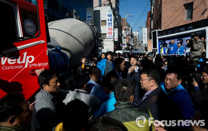 (서울=포커스뉴스) 4일 오전 전혜숙 더불어민주당 서울 광진갑 후보 선거사무소 인근 골목에서 김종인 비대위 대표 겸 선대위원장과 전 후보 등이 유세차량에 올라 지지를 호소하던 중 통행에 불만을 가진 레미콘 기사로부터 항의를 받고 있다.