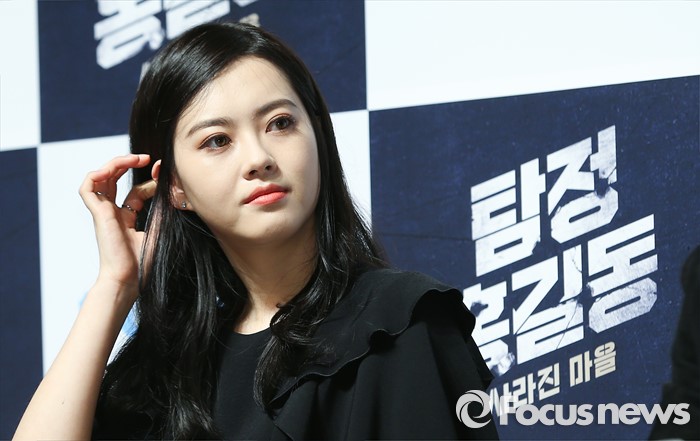 (서울=포커스뉴스) 4일 오전 서울 강남구 압구정 CGV에서 열린 영화 '탐정 홍길동 : 사라진 마을' 제작보고회에 참석한 배우 고아라가 머리카락을 정돈하고 있다.