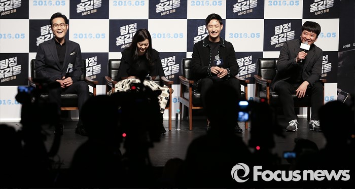 (서울=포커스뉴스) 4일 오전 서울 강남구 압구정 CGV에서 열린 영화 '탐정 홍길동 : 사라진 마을' 제작보고회에 참석한 조성희(오른쪽) 감독이 인사말을 하고 있다. 왼쪽부터 배우 김성균, 고아라, 이제훈, 조성희 감독.