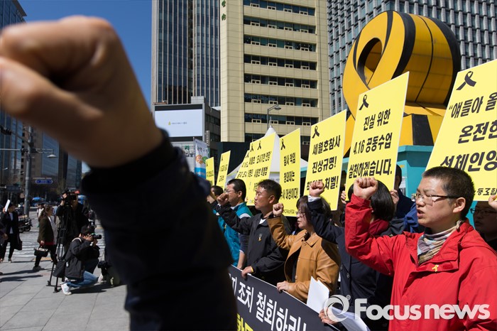 (서울=포커스뉴스) 4일 오전 서울 광화문광장에서 전국교직원노동조합 조합원들이 세월호 참사 2주기 공동수업 및 실천활동 선포 기자회견 중 교육부의 416교과서 금지 조치 철회 촉구하는 구호를 외치고 있다.