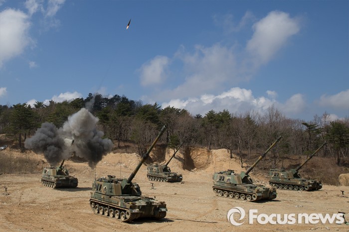 (고성=포커스뉴스) 4일 오전 강원도 고성 야촌리사격장에서 열린 '2016년 전반기 해상사격 훈련'에서 육군 8군단 포병대대 소속 K-9 자주포가 사격을 하고 있다.