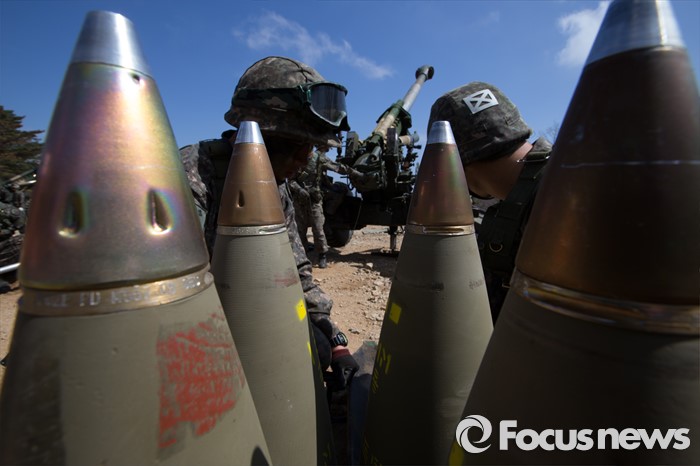 (고성=포커스뉴스) 4일 오전 강원도 고성 야촌리사격장에서 열린 '2016년 전반기 해상사격 훈련'에서 육군 8군단 포병대대 소속 장병들이 155mm 견인포로 훈련을 하고 있다.