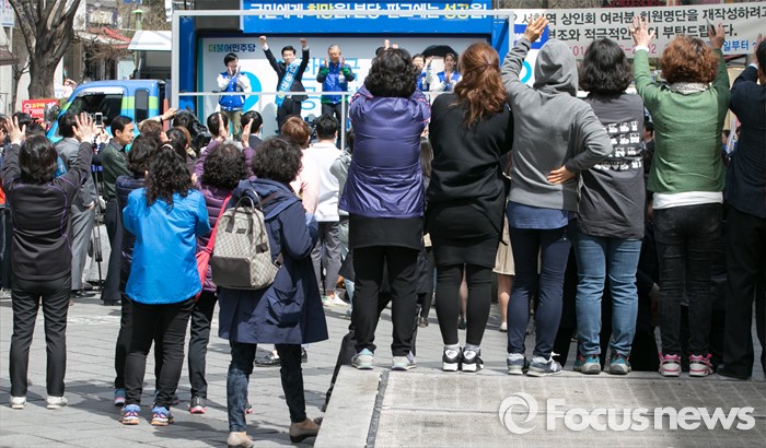 (성남=포커스뉴스) 4일 오후 경기도 서현역 인근 거리에서 시민 및 지지자들이 더불어민주당 성남 분당구 선거유세를 지켜보고 있다.