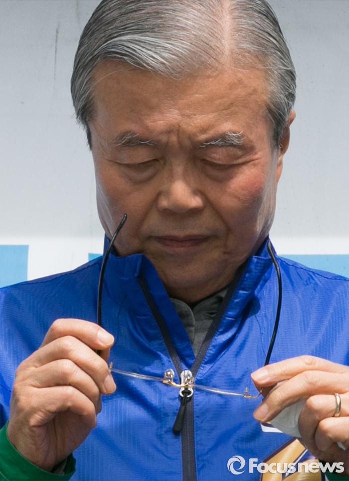 (성남=포커스뉴스) 4일 오후 경기도 서현역 인근 거리에서 열린 더불어민주당 성남 분당구 선거유세에 참석한 김종인 비대위 대표 겸 선대위원장이 안경을 고쳐쓰고 있다.