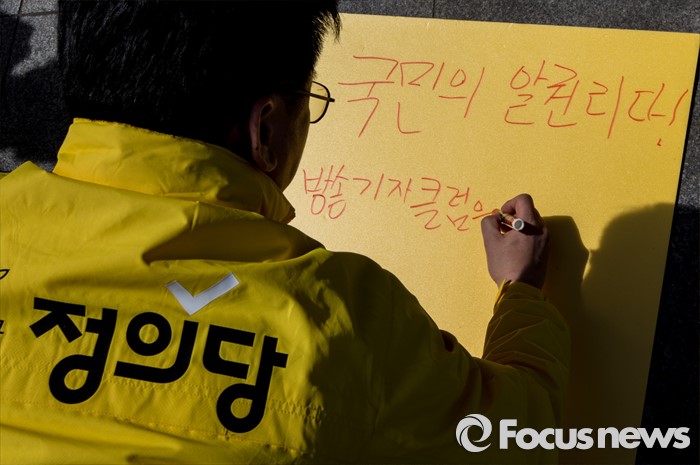 표서울=포커스뉴스) 4일 오후 서울 종로구 세종문화회관 앞에서 열린 '정의당, 방송기자클럽 초청 토론회 배제에 대한 항의 긴급기자회견'에 참석한 이혁재 사무총장이 손팻말에 구호를 적고 있다.