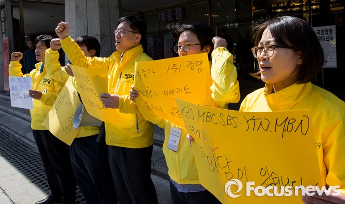 표서울=포커스뉴스) 4일 오후 서울 종로구 세종문화회관 앞에서 열린 '정의당, 방송기자클럽 초청 토론회 배제에 대한 항의 긴급기자회견'에 참석한 이혁재 사무총장과 추혜선 비례후보를 비롯한 당직자들이 구호를 외치고 있다.