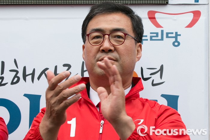 (김해=포커스뉴스) 이만기 새누리당 김해을 후보가 4일 오후 경남 김해시 내외로 외동전통시장 앞에서 유세 중, 박수치고 있다.