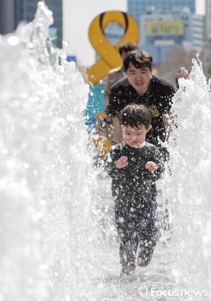 (서울=포커스뉴스) 4일 오후 서울 광화문광장 분수대에서 한 어린이가 물장난을 치고 있다.