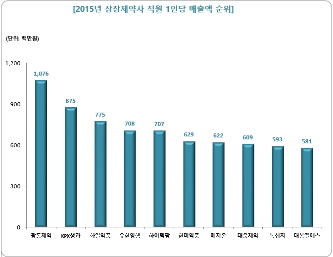 상장제약사 중 직원 1인당 매출액 1위는 광동제약이었다. 이 회사는 계약직을 포함해 888명의 직원이 근무하고 있으며 1인당 매출액이 10억7600만원에 달했다. 지난해 소모성자재 구매대행업체 코리아이플랫폼을 인수하며 회사 매출이 크게 늘어 외형성장에 따른 영향으로 풀이된다.