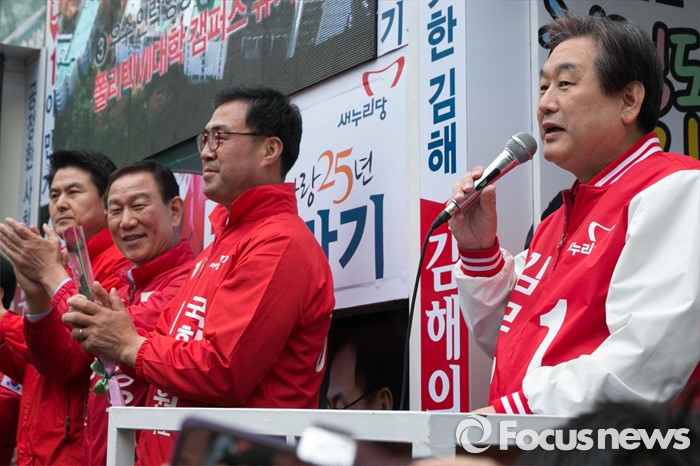 (김해=포커스뉴스) 김무성(오른쪽) 새누리당 대표가 4일 오후 경남 김해시 내외로 외동전통시장 앞에서 이만기(오른쪽 두번째) 김해을 후보 지원유세를 하고 있다.