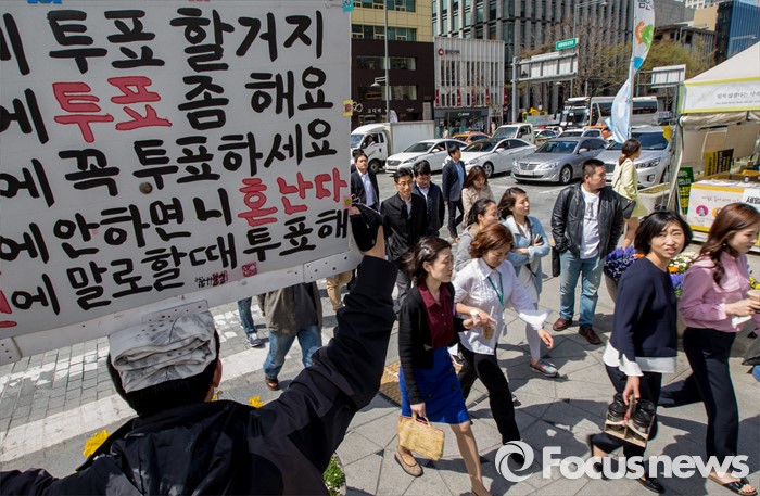(서울=포커스뉴스) 4일 오후 서울 광화문광장에서 한 시민이 투표를 독려하는 손팻말을 들고 있다.
