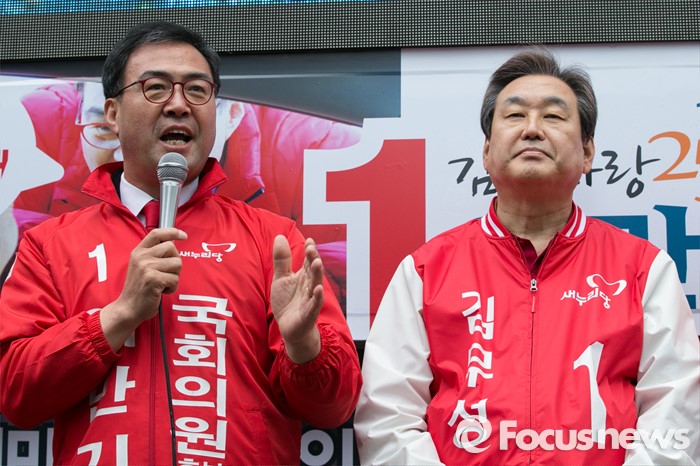 (김해=포커스뉴스) 이만기(왼쪽) 새누리당 김해을 후보가 4일 오후 경남 김해시 내외로 외동전통시장 앞에서 유세를 하고 있다. 오른쪽은 김무성 대표.