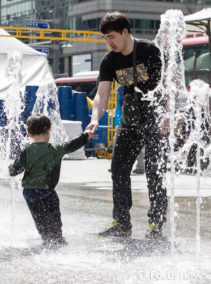 (서울=포커스뉴스) 4일 오후 서울 광화문광장 분수대에서 한 어린이가 아빠와 물장난을 치고 있다.