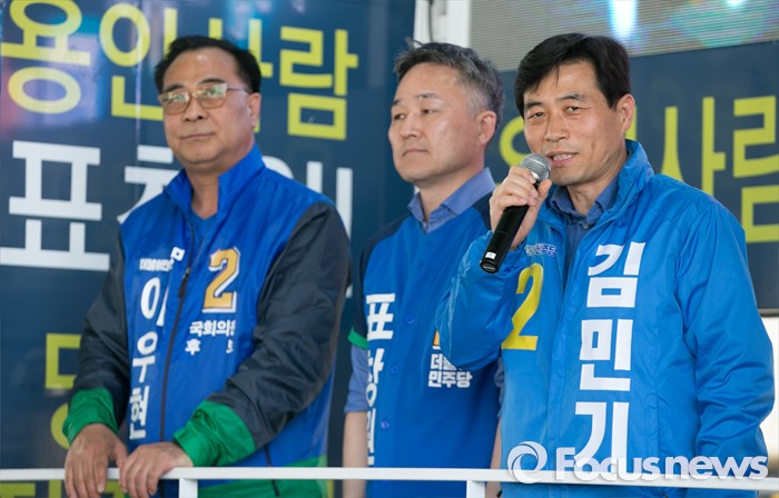 (용인=포커스뉴스) 4일 오후 경기도 이마트 죽전점 앞 광장에서 열린 더불어민주당 용인지역 합동유세에 참석한 김민기 용인을 후보가 지지를 호소하고 있다. 왼쪽부터 이우현 용인병, 표창원 용인정 후보, 김 후보.