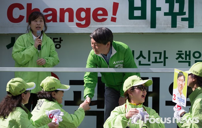 (서울=포커스뉴스) 안철수 국민의당 상임공동대표가 4일 오후 서울 용산구 용문시장에서 곽태원 용산구 후보 지원유세를 하던 중 선구원동원과 인사하고 있다.