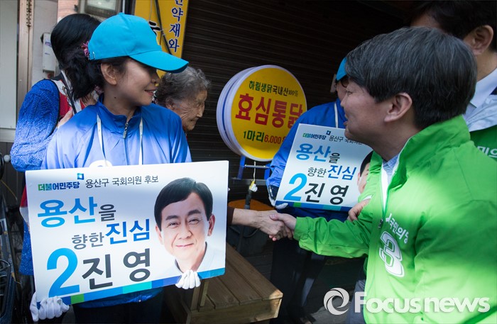 (서울=포커스뉴스) 안철수 국민의당 상임공동대표가 4일 오후 서울 용산구 용문시장에서 곽태원 용산구 후보 지원유세를 하던 중 더불어민주당 진영 후보 선거운동원들과 마주치고 있다.