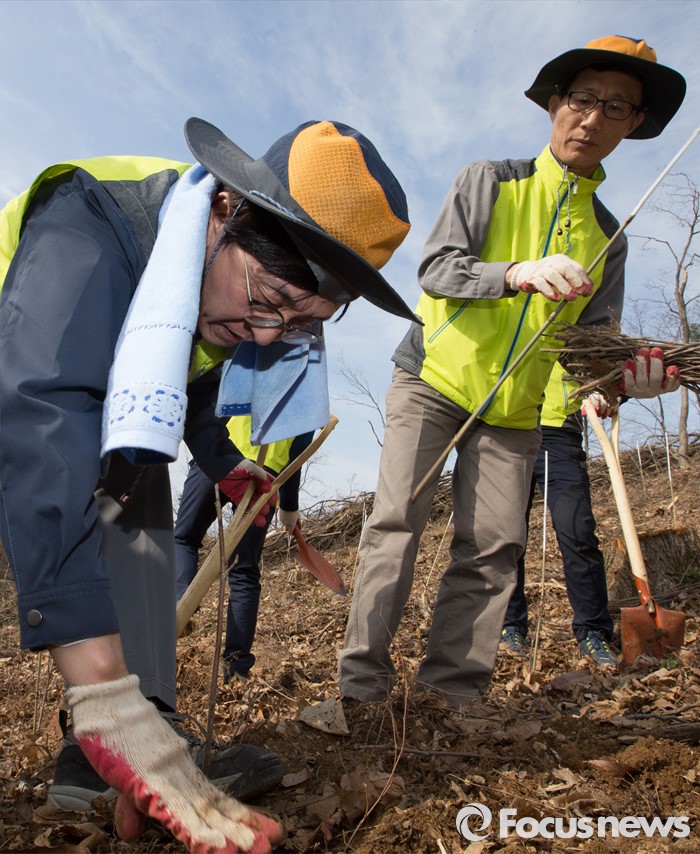 (세종=포커스뉴스) 김경환 국토교통부차관과 직원들이 식목일을 앞두고 4일 오후 세종시 금남면 영곡리 야산에서 나무심기를 하고 있다.