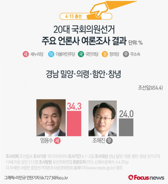 | △ [그래픽] 4·13총선 경남 밀양·의령·함안·창녕 여론조사결과 |