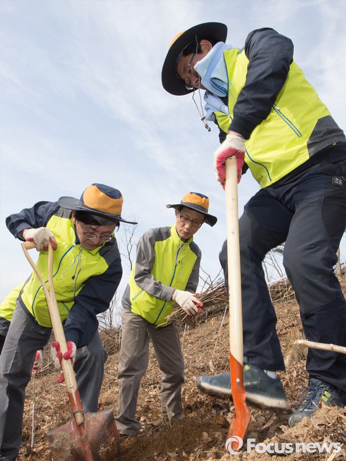 (세종=포커스뉴스) 김경환 국토교통부차관과 직원들이 식목일을 앞두고 4일 오후 세종시 금남면 영곡리 야산에서 나무심기를 하고 있다.