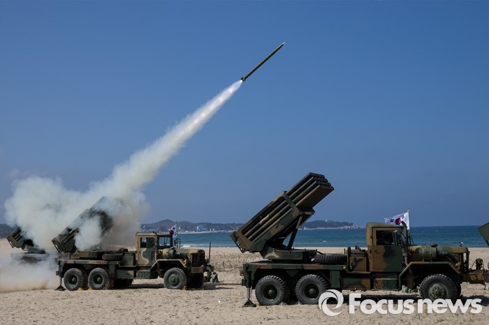 (고성=포커스뉴스) 4일 오후 강원도 고성 송지호해변에서 열린 '2016년 전반기 해상사격 훈련'에서 육군 8군단 포병대대 소속 130mm 다련장 구룡이 로켓탄을 발사하고 있다.
