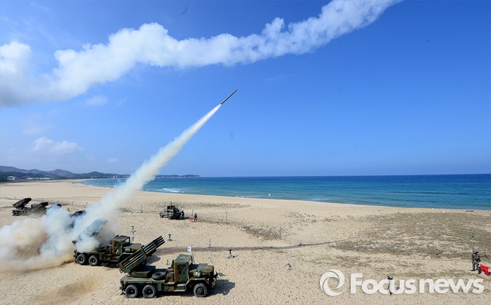 (고성=포커스뉴스) 4일 오후 강원도 고성 송지호해변에서 열린 '2016년 전반기 해상사격 훈련'에서 육군 8군단 포병대대 소속 130mm 다련장 구룡이 로켓탄을 발사하고 있다.
