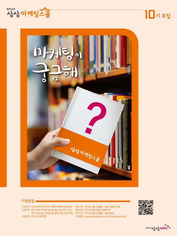 (서울=포커스뉴스) KT&G은 '상상마케팅스쿨' 10기 수강생 1200명을 모집한다고 4일 밝혔다. 모집 대상은 전국 대학생이다.